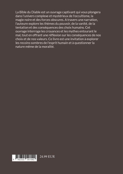 La Bible du Diable est un ouvrage captivant qui vous plongera dans l'univers complexe et mystérieux de l'occultisme, la magie noire et des forces obscures. A travers une narration, l'auteure explore les thèmes du pouvoir, de la vanité, de la tentation et des conséquences des choix humains. Cet ouvrage interroge les croyances et les mythes entourant le mal, tout en offrant une réflexion sur les conséquences de nos choix et de nos valeurs. Ce livre est une invitation à explorer les recoins sombres de l'esprit humain et à questionner la nature même de la moralité.
