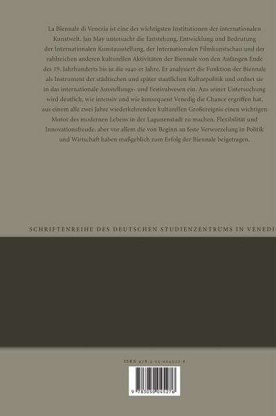 La Biennale di Venezia gilt neben der documenta in Kassel als eine der wichtigsten Institutionen der internationalen Kunstwelt. Jan May untersucht in seiner Arbeit die Bedeutung der Internationalen Kunstausstellung, der Internationalen Filmkunstschau und der zahlreichen anderen kulturellen Aktivitäten der Biennale von den Anfängen Ende des 19. Jahrhunderts bis in die 1940er Jahre. Er analysiert ihre Funktion als Instrument der städtischen und später staatlichen Kulturpolitik und ordnet die Biennale in das internationale Ausstellungs- und Festivalwesen ein. Chronologisch führt der Autor durch die Geschichte der 1895 als kleine Kunstausstellung gestarteten Ausstellungsreihe, die mit der Übernahme des nationalen Pavillonkonzepts 1907 vor und nach dem Ersten Weltkrieg große Erfolge feiern konnte. Die internationale Resonanz auf die Biennale, die anhand zahlreicher Quellen dokumentiert wird, war ein Garant für diesen Erfolg. Die Verstaatlichung 1930 und der damit verbundene infrastrukturelle Ausbau machten die Biennale zur wichtigsten internationalen Kunstausstellungsreihe weltweit. Die Abkehr von der Internationalität führte Ende der 1930er Jahre mit der Kooperation mit der nationalsozialistischen Kulturpoltik zu ihrer größten Krise. Die Arbeit endet mit dem Jahr 1948, dem Startpunkt der bis heute anhaltenden Erfolgsgeschichte, deren Grundlagen jedoch in den Entwicklungen der ersten 50 Jahre ihres Bestehens liegen. Der Autor zeigt, wie intensiv und wie konsequent Venedig die Chance ergriffen hat, aus einem alle zwei Jahre wiederkehrenden kulturellen Großereignis einen wichtigen Motor des modernen Lebens in der Lagunenstadt zu machen. Hier galt es wichtige Forschungslücken zu schließen, aber auch Erkenntnisse verschiedener Disziplinen zusammenzufassen. Es wird deutlich, dass die Flexibilität und Innovationsfreude, vor allem aber auch die von Beginn an feste Verwurzelung in Politik und Wirtschaft maßgeblich zum Erfolg der Biennale beigetragen haben.