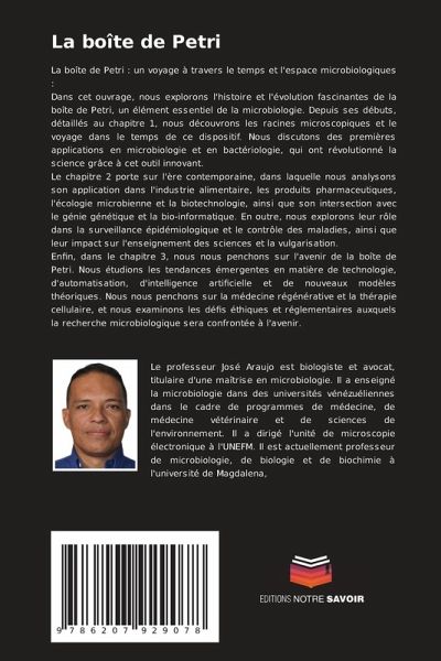 La boîte de Petri : un voyage à travers le temps et l'espace microbiologiques :Dans cet ouvrage, nous explorons l'histoire et l'évolution fascinantes de la boîte de Petri, un élément essentiel de la microbiologie. Depuis ses débuts, détaillés au chapitre 1, nous découvrons les racines microscopiques et le voyage dans le temps de ce dispositif. Nous discutons des premières applications en microbiologie et en bactériologie, qui ont révolutionné la science grâce à cet outil innovant.Le chapitre 2 porte sur l'ère contemporaine, dans laquelle nous analysons son application dans l'industrie alimentaire, les produits pharmaceutiques, l'écologie microbienne et la biotechnologie, ainsi que son intersection avec le génie génétique et la bio-informatique. En outre, nous explorons leur rôle dans la surveillance épidémiologique et le contrôle des maladies, ainsi que leur impact sur l'enseignement des sciences et la vulgarisation.Enfin, dans le chapitre 3, nous nous penchons sur l'avenir de la boîte de Petri. Nous étudions les tendances émergentes en matière de technologie, d'automatisation, d'intelligence artificielle et de nouveaux modèles théoriques. Nous nous penchons sur la médecine régénérative et la thérapie cellulaire, et nous examinons les défis éthiques et réglementaires auxquels la recherche microbiologique sera confrontée à l'avenir.