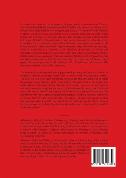 The extraordinary side-spouted gold jug hereby presented and discussed was found in the Royal Tomb III discovered under room 57 in the North-West Palace at Nimrud. The gold jug was, with other astonishing grave goods probably belonging to Hamâ (an Assyrian queen unknown up to recent times), in bronze Coffin 2, one of the three coffins placed in the antechamber. The aim of this study is not only to shed light on this unique vessel, investigating the method of manufacture, decoration, and functional aspect, but also to identify the possible workshop and date range of production. The comparison with coeval archaeological findings places it within a historical framework of artistic, economic and socio-political interactions. The combined results of these analyses suggest that the golden jug, instead of a gift or tribute, may have been produced for the royal court in the Neo-Assyrian international cultural milieu, into which manifold traditions coexisted. La straordinaria brocca in oro protagonista di questo studio venne rinvenuta all'interno della Tomba reale III al di sotto dell'ambiente 57 del Palazzo Nord-Ovest di Nimrud. La brocca faceva parte, insieme ad altri oggetti preziosi del ricchissimo corredo funerario di Hamâ, una regina assira sconosciuta fino al momento della scoperta della tomba, deposti nel Sarcofago 2, rinvenuto con altri due sarcofagi bronzei nell'anticamera dell'ipogeo. Obbiettivo di questo studio è stato non soltanto mettere in luce la tecnica di manifattura e le peculiari caratteristiche della decorazione figurata di questa piccola brocca ma anche la formulazione di ipotesi interpretativi riguardanti la sua cronologia, l'area di produzione e la funzione. L'individuazione di confronti sia formali che iconografici e tematici ha permesso di inserire la brocca in un variegato lessico artistico internazionale in cui convivono tradizioni culturali differenti, e di riconoscerla come una vivida testimonianza delle diverse dinamiche di produzione e diffusione degli oggetti di lusso nei primi secoli del I millennio a.C., oltre che degli usi funerari e della complessa struttura sociale della corte assira.