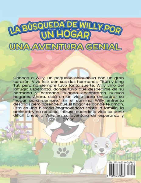 Conoce a Willy, un pequeño chihuahua con un gran corazón. Vive feliz con sus dos hermanos, Titán y King Tut, pero no siempre tuvo tanta suerte. Willy vino del Refugio Esperanza, donde tuvo que despedirse de su hermana y hermano cuando encontraron nuevos hogares. Ahora, está en un viaje para encontrar su "hogar para siempre." En el camino, Willy enfrenta desafíos pero aprende que el hogar es donde te aman. Esta es una historia conmovedora sobre la familia, la amistad, y no rendirse, incluso cuando la vida se pone difícil. Únete a Willy en su aventura de esperanza y amor.