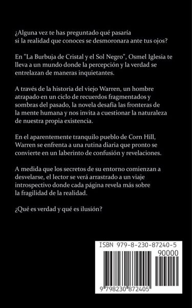 Adéntrate en "La Burbuja de Cristal y el Sol Negro", una cautivadora novela de Osmel Iglesia que desafía las fronteras de la realidad y la percepción. A través de los ojos del viejo Warren, un hombre atrapado en un ciclo de recuerdos fragmentados y sombras del pasado, la historia te sumerge en un laberinto psicológico donde cada página revela más sobre la fragilidad de la mente humana. En el tranquilo pueblo de Corn Hill, la rutina diaria de Warren se convierte en un viaje inquietante hacia la confusión y la revelación. A medida que los secretos de su entorno comienzan a desvelarse, el lector se verá arrastrado a una exploración profunda de la identidad y la memoria. ¿Qué es verdad y qué es ilusión? Con un estilo literario que fusiona la fantasía con el realismo mágico, Osmel Iglesia crea una narrativa envolvente que no solo entretiene, sino que también invita a la reflexión sobre la condición humana. "La Burbuja de Cristal y el Sol Negro" es una obra imprescindible para aquellos que buscan entender los matices de la existencia y la lucha por la claridad en un mundo lleno de sombras. Prepárate para un viaje que cambiará tu percepción de la realidad