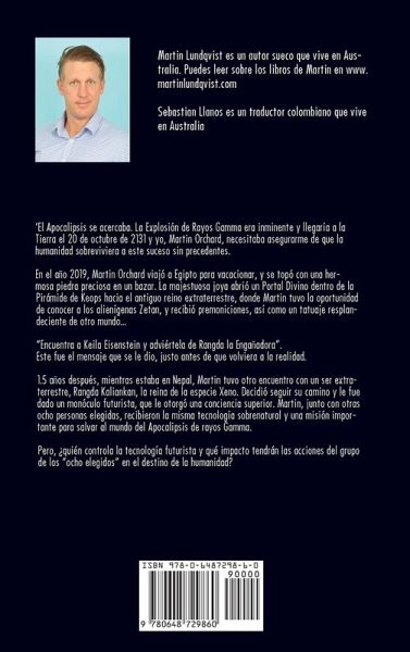 'El Apocalipsis se acercaba. La Explosión de Rayos Gamma era inminente y llegaría a la Tierra el 20 de octubre de 2131 y yo, Martin Orchard, necesitaba asegurarme de que la humanidad sobreviviera a este suceso sin precedentes.En el año 2019, Martin Orchard viajó a Egipto para vacacionar, y se topó con una hermosa piedra preciosa en un bazar. La majestuosa joya abrió un Portal Divino dentro de la Pirámide de Keops hacia el antiguo reino extraterrestre, donde Martin tuvo la oportunidad de conocer a los alienígenas Zetan, y recibió premoniciones, así como un tatuaje resplandeciente de otro mundo..."Encuentra a Keila Eisenstein y adviértela de Rangda la Engañadora".Este fue el mensaje que se le dio, justo antes de que volviera a la realidad.1.5 años después, mientras estaba en Nepal, Martin tuvo otro encuentro con un ser extraterrestre, Rangda Kaliankan, la reina de la especie Xeno. Decidió seguir su camino y le fue dado un monóculo futurista, que le otorgó una conciencia superior. Martin, junto con otras ocho personas elegidas, recibieron la misma tecnología sobrenatural y una misión importante para salvar al mundo del Apocalipsis de rayos Gamma.Pero, ¿quién controla la tecnología futurista y qué impacto tendrán las acciones del grupo de los "ocho elegidos" en el destino de la humanidad?