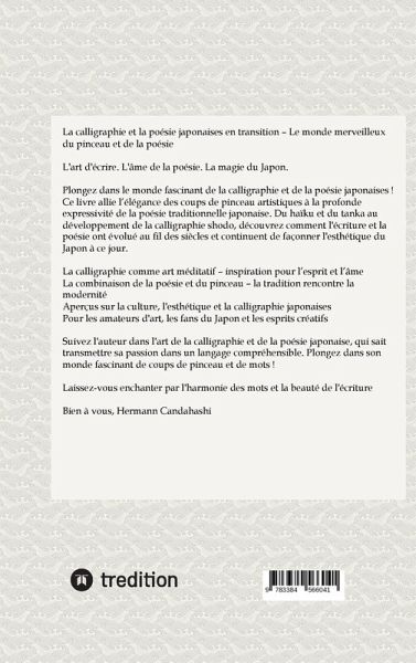 La calligraphie et la poésie japonaises en transition - Le monde merveilleux du pinceau et de la poésiePlongez dans le monde fascinant de la calligraphie et de la poésie japonaises ! Ce livre combine la beauté intemporelle de la calligraphie japonaise avec la poésie profonde des haïkus et tankas traditionnels. Apprenez comment la calligraphie et la poésie ont évolué au fil des siècles et découvrez le lien entre l'élégance esthétique, l'art méditatif et l'expressivité poétique. Une fois de plus, l'auteur Hermann Candahashi prouve qu'il est un connaisseur de la culture japonaise et qu'il a à juste titre un nom de renommée internationale.Parfait pour les amateurs de calligraphie, les fans du Japon et les passionnés de poésieDes aperçus inspirants sur l'art, la culture et l'histoire de l'écriture japonaiseZen et Écriture - Une combinaison harmonieuse de tradition et de modernitéIdéal pour la méditation, la pleine conscience et l'inspiration créativeQue vous soyez artiste, amateur d'écriture ou simplement fasciné par la culture japonaise, ce livre vous emmènera, de manière compréhensible, dans un monde plein de poésie, d'harmonie et de coups de pinceau artistiques. Laissez-vous inspirer et découvrez la beauté de la calligraphie japonaise de manière philosophique !Bien à vous, Hermann Candahashi