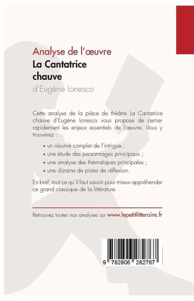 Décryptez La Cantatrice chauve d'Eugène Ionesco avec l¿analyse du PetitLitteraire.fr ! Que faut-il retenir de La Cantatrice chauve, la célèbre pièce emblématique du théâtre de l'absurde ? Retrouvez tout ce que vous devez savoir sur cette ¿uvre dans une analyse complète et détaillée. Vous trouverez notamment dans cette fiche :    ¿ Un résumé complet    ¿ Une présentation des personnages principaux tels que Monsieur et Madame Smith, et Monsieur et Madame Martin    ¿ Une analyse des spécificités de l¿¿uvre : le théâtre de l'absurde, une mise à mal du langage et une critique de la bourgeoisie Une analyse de référence pour comprendre rapidement le sens de l¿¿uvre. LE MOT DE L¿ÉDITEUR : « Dans cette nouvelle édition de notre analyse de La Cantatrice chauve (2016), avec Delphine Leloup, nous fournissons des pistes pour décoder cette pièce qui a révolutionné le théâtre contemporain. Notre analyse permet de faire rapidement le tour de l¿¿uvre et d¿aller au-delà des clichés. » Stéphanie FELTEN À propos de la collection LePetitLitteraire.fr : Plébiscité tant par les passionnés de littérature que par les lycéens, LePetitLittéraire.fr est considéré comme une référence en matière d¿analyse d¿¿uvres classiques et contemporaines. Nos analyses, disponibles au format papier et numérique, ont été conçues pour guider les lecteurs à travers la littérature. Nos auteurs combinent théories, citations, anecdotes et commentaires pour vous faire découvrir et redécouvrir les plus grandes ¿uvres littéraires.  LePetitLittéraire.fr est reconnu d¿intérêt pédagogique par le ministère de l¿Éducation. Plus d¿informations sur http://www.lepetitlitteraire.fr