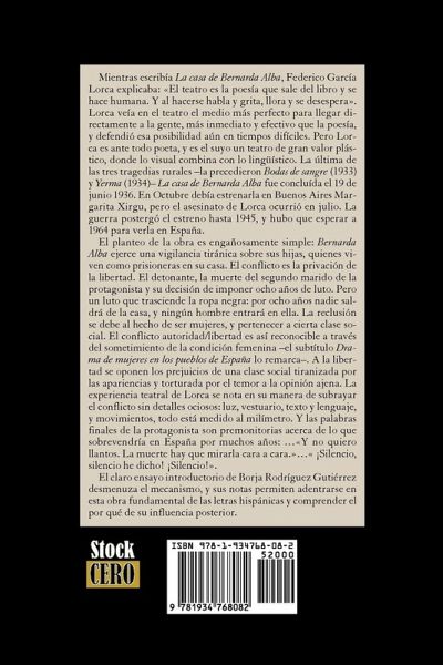 As he wrote La casa de Bernarda Alba, Federico Garcia Lorca explained: "drama is poetry that escapes the book and becomes human. And as it is being made it talks and shouts, cries and despairs". Lorca saw in theatre the most perfect means to reach people's souls, more immediate and effective than poetry, and he kindled this possibility even amidst difficult times. Lorca is, mainly, a poet, and as so his plays possess great visual as well as linguistic virtue. The last of the rural tragedies -Bernarda Alba was preceded by Bodas de sangre (1933) and Yerma (1934)- was finished in June 1936. It was meant to open in Buenos Aires in October, played by the Margarita Xirgu company, but Lorca was murdered in July. War events postponed the opening until 1945, but in Spain the play would stay banned until 1964. The plot is deceivingly simple: Bernarda Alba exerts a tyrant control upon her daughters, who live as prisoners within her house walls. The conflict is deprivation of freedom, blown up to tragic proportions by the death of Bernarda Alba's second husband and her decision to impose eight years of strict mourning. But this mourning goes far beyond the usual black clothing: during the following eight years no one will leave the house, and no man will enter. The reclusion is the results of them being women of a certain social position. The authority/freedom conflict is visible through the submission of the feminine condition -the subtitle Drama of women in the towns of Spain highlights this-. Freedom is stifled by the prejudices of a social class enslaved by appearance and tortured afraid by gossip. Lorca's theatrical experience is highly noticeable in his way of highlighting the conflict without superfluous details: lighting, costumes, text and language, and the actresses' movements, everything is measured to the last millimeter. And the closing words of the main character become a remarkable premonition of what would shroud Spain during many following years. "And I do not want sobbing. Death must be stared in her face". "¡Silence, silence I have said! ¡Silence! Professor Borja Rodriguez-Gutierrez adds to this edition a clear introductory essay that dismantles Garcia Lorca's clockwork mechanism, while introducing annotations that allow the reader to fully grasp the meaning of this influential cornerstone of Hispanic letters.
