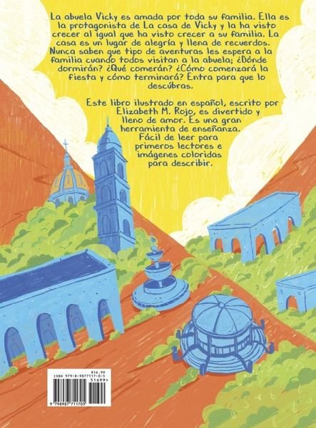 La abuela Vicky es amada por toda su familia. Ella es la protagonista de La casa de Vicky y la ha visto crecer al igual que ha visto crecer a su familia. La casa es un lugar de alegría y llena de recuerdos. Nunca saben que tipo de aventuras les espera a la familia cuando todos visitan a la abuela; ¿Dónde dormirán? ¿Qué comerán? ¿Cómo comenzará la fiesta y cómo terminará? Entra para que lo descúbras. Este libro ilustrado en español, escrito por Elizabeth M Rojo, es divertido y lleno de amor. Es una gran herramienta de enseñanza. Fácil de leer para primeros lectores e imágenes coloridas para describir. ------------------------------------- Abuela Vicky is loved by all her family. She is at the center of La casa de Vicky and has witnessed it grow just as the family grows. The house is a place of joy and full of memories. They never know what kind of adventures await the family when they all visit abuela; Where will they sleep? What will they eat? How will the party get started and how will it end? Come inside to be a part of it and find out. This Spanish picture book, written by Elizabeth M. Rojo, is fun and full of family love. It will make a great addition to any children's library, and it is a great teaching tool. Easy to read for early readers and colorful images to describe.