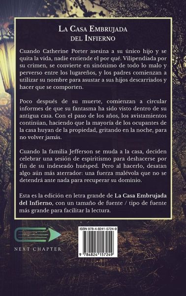 Cuando Catherine Porter asesina a su único hijo y se quita la vida, nadie entiende el por qué. Vilipendiada por su crimen, se convierte en sinónimo de todo lo malo y perverso entre los lugareños, y los padres comienzan a utilizar su nombre para asustar a sus hijos descarriados y hacer que se comporten. Poco después de su muerte, comienzan a circular informes de que su fantasma ha sido visto dentro de su antigua casa. Con el paso de los años, los avistamientos continúan, haciendo que la mayoría de los ocupantes de la casa huyan de la propiedad, gritando en la noche, para no volver jamás. Cuando la familia Jefferson se muda a la casa, deciden celebrar una sesión de espiritismo para deshacerse por fin de su indeseado huésped. Pero al hacerlo, desatan algo aún más aterrador: una fuerza malévola que no se detendrá ante nada para recuperar su dominio. Esta es la edición en letra grande de La Casa Embrujada del Infierno, con un tamaño de fuente / tipo de fuente más grande para facilitar la lectura.