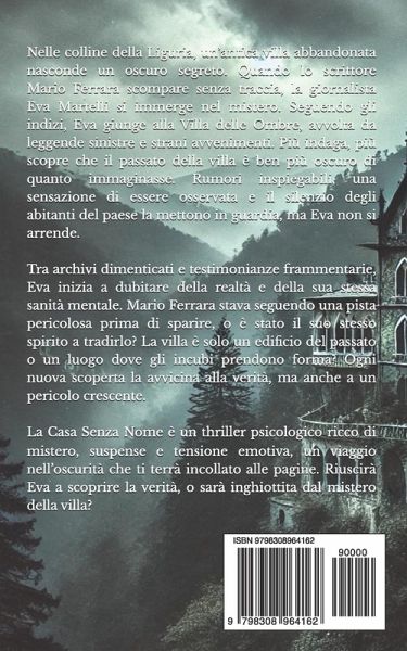 Nelle tranquille colline della Liguria, una villa abbandonata domina il paesaggio, un luogo dimenticato che custodisce segreti inquietanti. Quando il celebre scrittore Mario Ferrara scompare senza lasciare traccia, la giornalista Eva Martelli viene attratta dal mistero che circonda la sua sparizione. Decisa a scoprire la verità, segue gli indizi che la conducono fino all'enigmatica Villa delle Ombre, un'antica dimora avvolta da leggende e sussurri inquietanti. Più Eva indaga, più si rende conto che il passato della villa è molto più oscuro di quanto immaginasse. Strani eventi, rumori inspiegabili e una costante sensazione di essere osservata la convincono che qualcuno-o qualcosa-non vuole che la verità venga alla luce. Gli abitanti del paese evitano di parlare della casa e chi osa farlo la mette in guardia: deve stare lontana. Ma Eva non è disposta a fermarsi. Nel suo viaggio tra archivi dimenticati e testimonianze frammentarie, la giornalista inizia a mettere in discussione la realtà stessa. Mario Ferrara era davvero sulle tracce di qualcosa di pericoloso prima di sparire? O è stata la sua stessa mente a tradirlo? E se la villa non fosse solo un semplice edificio del passato, ma un luogo in cui gli incubi prendono forma? Ogni scoperta la avvicina alla verità, ma anche a un pericolo sempre più concreto. Mentre il confine tra memoria e follia si assottiglia, Eva si rende conto che alcune porte, una volta aperte, non possono più essere chiuse. Ambientato sullo sfondo evocativo della Riviera Ligure, La Casa Senza Nome è un thriller psicologico avvincente che intreccia mistero, suspense e il potere inquietante del passato. Con una narrazione ricca di tensione, personaggi profondamente caratterizzati e una trama che tiene il lettore col fiato sospeso, il romanzo esplora il sottile equilibrio tra verità e inganno, percezione e realtà. Per gli amanti dei thriller psicologici e delle storie dal fascino gotico, La Casa Senza Nome offre un'esperienza di lettura coinvolgente e inquietante. Eva riuscirà a scoprire la verità prima che sia troppo tardi, o finirà per perdersi nei misteri della villa, proprio come Mario Ferrara?