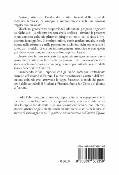 L'attenta analisi dei caratteri formali della cattedrale romanica ferrarese rivela un preciso simbolismo sottostante a ogni scelta architettonica, simbolismo frutto della rigorosa impalcatura razionale del progettista. Gli schemi geometrico-proporzionali adottati nel progetto originario da Nicholaus, l'architetto scultore che la realizza, sono indice infatti della presenza di un contesto culturale platonico-pitagorico entro cui si situa il programma iconografico. Nicholaus, infatti, vuole rendere attuale, in scala ridotta nelle strutture e nelle proporzioni architettoniche tra le parti e il tutto, un modello di cosmo intrinsecamente armonico e con questa grandiosa operazione testimoniare l'immagine di Cristo. L'esame degli edifici sacri più strettamente correlati col duomo di Ferrara, permette inoltre di riscostruire l'evoluzione culturale che, attraverso la tappa ferrarese, si snoda dai precedenti delle cattedrali di Modena e Piacenza fino a San Zeno e al duomo di Verona.