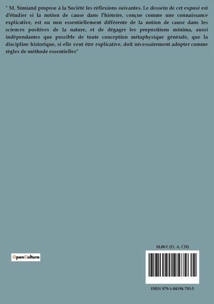 Comment les événements du passé influencent-ils notre compréhension du présent? ' La causalité en histoire ' de François Simiand explore cette question en profondeur, en examinant les mécanismes par lesquels les faits historiques sont interprétés et reliés entre eux. Situé au cur du XXe siècle, cet ouvrage s'inscrit dans un contexte où les sciences sociales cherchent à se structurer et à se légitimer face aux disciplines plus établies. Simiand, sociologue et économiste, propose une analyse rigoureuse des méthodes historiques, interrogeant la manière dont les historiens établissent des liens de cause à effet entre les événements. L'auteur s'attache à démontrer que l'histoire ne se contente pas de relater des faits, mais qu'elle doit également en expliquer les raisons et les conséquences. En s'appuyant sur des exemples concrets, Simiand met en lumière les défis auxquels sont confrontés les historiens lorsqu'ils tentent de reconstruire le passé. Il aborde des thématiques variées telles que l'objectivité, la subjectivité, et la complexité des interactions humaines à travers le temps. Ce livre se distingue par sa capacité à clarifier les enjeux méthodologiques de l'histoire, tout en offrant une réflexion sur la manière dont les récits historiques influencent notre perception du monde actuel. En développant une approche méthodique et critique, ' La causalité en histoire ' nous apprend à mieux comprendre les changements qui façonnent notre société. Par l'analyse des étapes historiques, nous percevons désormais mieux les liens subtils entre les événements passés et les réalités contemporaines, modifiant ainsi notre compréhension du monde.