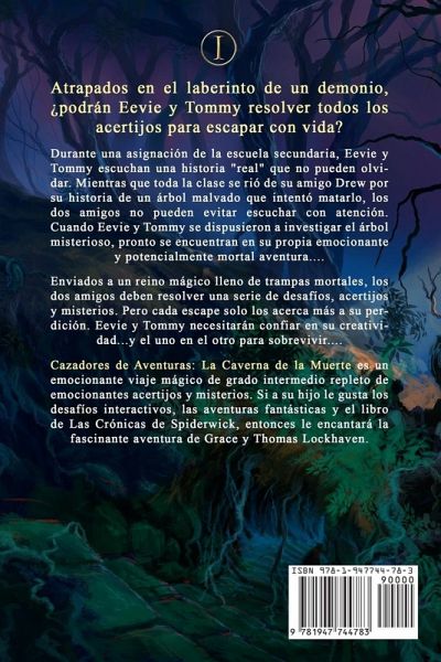 Atrapados en el laberinto de un demonio, ¿podrán Eevie y Tommy resolver todos los acertijos para escapar con vida? Estando en la lista de los 100 más vendidos, La Caverna de la Muerte es un gran libro para los preadolescentes maduros. Durante una asignación de la escuela secundaria, Eevie y Tommy escuchan una historia "real" que no pueden olvidar. Mientras que toda la clase se rió de su amigo Drew por su historia de un árbol malvado que intentó matarlo, los dos amigos no pueden evitar escuchar con atención. Cuando Eevie y Tommy se dispusieron a investigar el árbol misterioso, pronto se encuentran en su propia emocionante y potencialmente mortal aventura.... Enviados a un reino mágico lleno de trampas mortales, los dos amigos deben resolver una serie de desafíos, acertijos y misterios. Pero cada escape solo los acerca más a su perdición. Eevie y Tommy necesitarán confiar en su creatividad...y el uno en el otro para sobrevivir.... Cazadores de Aventuras: La Caverna de la Muerte es un emocionante viaje mágico de grado intermedio repleto de emocionantes acertijos y misterios. Si a su hijo le gusta los desafíos interactivos, las aventuras fantásticas y el libro de Las Crónicas de Spiderwick, entonces le encantará la fascinante aventura de Grace y Thomas Lockhaven. ¡Compra Cazadores de Aventuras para intentar adivinar el final mágico hoy mismo!