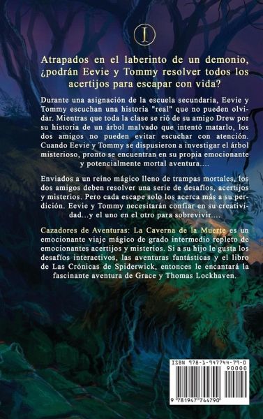 Atrapados en el laberinto de un demonio, ¿podrán Eevie y Tommy resolver todos los acertijos para escapar con vida? Estando en la lista de los 100 más vendidos, La Caverna de la Muerte es un gran libro para los preadolescentes maduros. Durante una asignación de la escuela secundaria, Eevie y Tommy escuchan una historia "real" que no pueden olvidar. Mientras que toda la clase se rió de su amigo Drew por su historia de un árbol malvado que intentó matarlo, los dos amigos no pueden evitar escuchar con atención. Cuando Eevie y Tommy se dispusieron a investigar el árbol misterioso, pronto se encuentran en su propia emocionante y potencialmente mortal aventura.... Enviados a un reino mágico lleno de trampas mortales, los dos amigos deben resolver una serie de desafíos, acertijos y misterios. Pero cada escape solo los acerca más a su perdición. Eevie y Tommy necesitarán confiar en su creatividad...y el uno en el otro para sobrevivir.... Cazadores de Aventuras: La Caverna de la Muerte es un emocionante viaje mágico de grado intermedio repleto de emocionantes acertijos y misterios. Si a su hijo le gusta los desafíos interactivos, las aventuras fantásticas y el libro de Las Crónicas de Spiderwick, entonces le encantará la fascinante aventura de Grace y Thomas Lockhaven. ¡Compra Cazadores de Aventuras para intentar adivinar el final mágico hoy mismo!