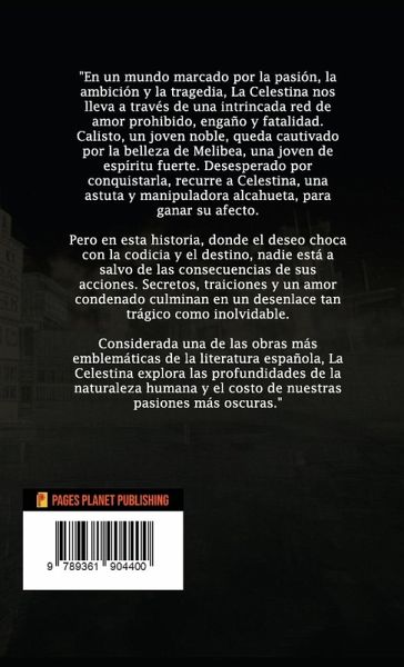 En un mundo marcado por la pasión, la ambición y la tragedia, La Celestina nos lleva a través de una intrincada red de amor prohibido, engaño y fatalidad. Calisto, un joven noble, queda cautivado por la belleza de Melibea, una joven de espíritu fuerte. Desesperado por conquistarla, recurre a Celestina, una astuta y manipuladora alcahueta, para ganar su afecto. Pero en esta historia, donde el deseo choca con la codicia y el destino, nadie está a salvo de las consecuencias de sus acciones. Secretos, traiciones y un amor condenado culminan en un desenlace tan trágico como inolvidable. Considerada una de las obras más emblemáticas de la literatura española, La Celestina explora las profundidades de la naturaleza humana y el costo de nuestras pasiones más oscuras.