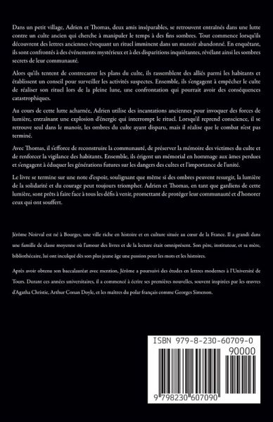 Dans un petit village, Adrien et Thomas, deux amis inséparables, se retrouvent entraînés dans une lutte contre un culte ancien qui cherche à manipuler le temps à des fins sombres. Tout commence lorsqu'ils découvrent des lettres anciennes évoquant un rituel imminent dans un manoir abandonné. En enquêtant, ils sont confrontés à des événements mystérieux et à des disparitions inquiétantes, révélant ainsi les sombres secrets de leur communauté. Alors qu'ils tentent de contrecarrer les plans du culte, ils rassemblent des alliés parmi les habitants et établissent un conseil pour surveiller les activités suspectes. Ensemble, ils s'engagent à empêcher le culte de réaliser son rituel lors de la pleine lune, une confrontation qui pourrait avoir des conséquences catastrophiques. Au cours de cette lutte acharnée, Adrien utilise des incantations anciennes pour invoquer des forces de lumière, entraînant une explosion d'énergie qui interrompt le rituel. Lorsqu'il reprend conscience, il se retrouve seul dans le manoir, les ombres du culte ayant disparu, mais il réalise que le combat n'est pas terminé. Avec Thomas, il s'efforce de reconstruire la communauté, de préserver la mémoire des victimes du culte et de renforcer la vigilance des habitants. Ensemble, ils érigent un mémorial en hommage aux âmes perdues et s'engagent à éduquer les générations futures sur les dangers des cultes et l'importance de l'unité. Le livre se termine sur une note d'espoir, soulignant que même si des ombres peuvent resurgir, la lumière de la solidarité et du courage peut toujours triompher. Adrien et Thomas, en tant que gardiens de cette lumière, sont prêts à faire face à tous les défis à venir, promettant de protéger leur communauté et d'honorer ceux qui ont souffert.