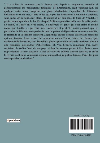 "La chambre obscure" est une uvre littéraire qui explore les nuances de l'enfance et les perceptions culturelles à travers une série de tableaux de murs et de croquis inspirés de la vie hollandaise. L'auteur, sous le pseudonyme d'Hildebrand, nous plonge dans un univers où les petits garçons hollandais sont décrits avec une précision et une affection particulières. Ces enfants, dynamiques et pleins de vie, sont présentés dans leur quotidien, avec leurs jeux, leurs joies et leurs petites misères. Hildebrand met en lumière les défis de l'enfance, tels que les malheurs liés à l'école et la perte des dents, tout en soulignant l'importance de préserver l'innocence et la joie de cette période de la vie. L'auteur critique également les institutions et les pratiques qui peuvent opprimer ou limiter l'épanouissement des jeunes. Par ailleurs, l'uvre aborde des thèmes plus larges, comme la perception des animaux dans les ménageries, où Hildebrand exprime son aversion pour ces lieux qui dénaturent la majesté des créatures sauvages. À travers ces récits, l'auteur invite à une réflexion sur la manière dont la société perçoit et traite les enfants et les animaux, tout en célébrant l'évolution de la culture hollandaise. "La chambre obscure" est ainsi une invitation à observer le monde avec un regard neuf, empreint de sensibilité et de compréhension.