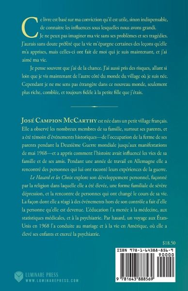José Campion McCarthy est née dans un petit village français. Elle a observé les nombreux membres de sa famille, surtout ses parents, et a été témoin d'événements historiques-de l'occupation de la ferme de ses parents pendant la Deuxième Guerre mondiale jusqu'aux manifestations de mai 1968-et a appris comment l'histoire avait influencé les vies de sa famille et de ses amis. Pendant une année de travail en Allemagne elle a rencontré des personnes qui lui ont raconté leurs expériences de la guerre.Le Hasard et les Choix explore son développement personnel, façonné par la religion dans laquelle elle a été élevée, une forme familiale de sévère dépression, et la rencontre de personnes qui ont changé le cours de sa vie. La façon dont elle a réagi à des événements hors de son contrôle a fait d'elle la personne qu'elle est devenue. L'éducation l'a menée à la médecine, aux statistiques médicales, et à la psychiatrie. Par hasard, un voyage aux États-Unis en 1968 l'a conduite au mariage et à la vie en Amérique, où elle a élevé ses enfants et exercé la psychiatrie.