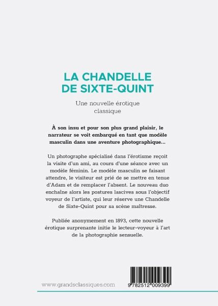 À son insu et pour son plus grand plaisir, le narrateur se voit embarqué en tant que modèle masculin dans une aventure photographique... POUR UN PUBLIC AVERTI. Un photographe spécialisé dans l'érotisme reçoit la visite d'un ami, au cours d'une séance avec un modèle féminin. Le modèle masculin se faisant attendre, le visiteur est prié de se mettre en tenue d'Adam et de remplacer l'absent. Le nouveau duo enchaîne alors les postures lascives sous l'objectif voyeur de l'artiste, qui leur réserve une Chandelle de Sixte-Quint pour sa scène maîtresse. Publiée anonymement en 1893, cette nouvelle érotique surprenante initie le lecteur-voyeur à l'art de la photographie sensuelle. EXTRAIT J¿entrai dans l¿atelier. Une jolie jeune femme s¿y trouvait, encore habillée et vêtue d¿une toilette très élégante. Elle parut un peu décontenancée à ma vue, mais après présentations elle reprit son aplomb. De plus, mon ami lui dit que j¿avais déjà fait connaissance avec elle, c¿est-à-dire avec son portrait ; en effet, dans l¿album souvent feuilleté par moi, je pus constater sa présence en une attitude qui la dispensait de faire la prude avec moi. Mais son image ne m¿avait pas autrement frappé et je vis avec plaisir que l¿original valait cent fois mieux que la photographie, ce qui me procura l¿occasion d¿un compliment à son adresse. C¿était une petite femme mariée, séparée de son mari et originaire d¿un pays voisin où les femmes ont la réputation d¿être excellentes pour l¿amour, faciles, chaudes, cochonnes, et je constatai plus tard moi-même qüelle soutenait dignement cette réputation. Elle se souciait peu des préjugés et encore moins de sa vertu que ses cascades avaient transformée en Niagara. Mais rien n¿égalait son mépris pour la pudeur dont la totale absence chez elle formait un piquant contraste avec son air élégant et sa physionomie distinguée. Moi-même, bien qüayant vu sa photographie à poil, j¿étais loin de soupçonner ce dont elle était capable et quel précieux sujet mon ami avait en elle. ¿ Nous allons commencer, dit celui-ci. Installez l¿appareil, je vais préparer le décor. À PROPOS DE LA COLLECTION Retrouvez les plus grands noms de la littérature érotique dans notre collection Grands classiques érotiques. Autrefois poussés à la clandestinité et relégués dans « l'Enfer des bibliothèques », les auteurs de ces ¿uvres incontournables du genre sont aujourd'hui reconnus mondialement. Du Marquis de Sade à Alphonse Momas et ses multiples pseudonymes, en passant par le lyrique Alfred de Musset ou la féministe Renée Dunan, les Grands classiques érotiques proposent un catalogue complet et varié qui contentera tant les novices que les connaisseurs.
