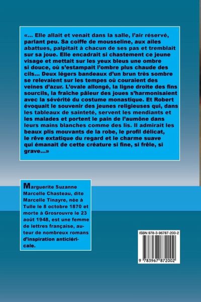 «... Elle allait et venait dans la salle, l’air réservé, parlant peu. Sa coiffe de mousseline, aux ailes abattues, palpitait à chacun de ses pas et tremblait sur sa joue. Elle encadrait si chastement ce jeune visage et mettait sur les yeux bleus une ombre si douce, où s’estampait l’ombre plus chaude des cils… Deux légers bandeaux d’un brun très sombre se relevaient sur les tempes où couraient des veines d’azur. L’ovale allongé, la ligne droite des fins sourcils, la fraîche pâleur des joues s’harmonisaient avec la sévérité du costume monastique. Et Robert évoquait le souvenir des jeunes religieuses qui, dans les tableaux de sainteté, servent les mendiants et les malades et portent le pain de l’aumône dans leurs mains blanches comme des lis. Il admirait les beaux plis mouvants de la robe, le profil délicat, le rêve extatique du regard et le charme suave qui émanait de cette créature si fine, si frêle, si grave...»