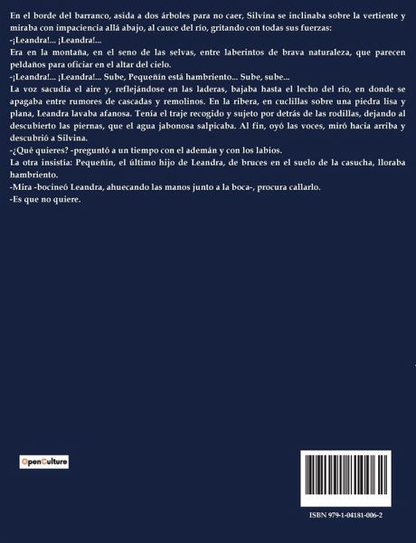 En el borde del barranco, asida a dos árboles para no caer, Silvina se inclinaba sobre la vertiente y miraba con impaciencia allá abajo, al cauce del río, gritando con todas sus fuerzas: -¡Leandra!... ¡Leandra!... Era en la montaña, en el seno de las selvas, entre laberintos de brava naturaleza, que parecen peldaños para oficiar en el altar del cielo. -¡Leandra!... ¡Leandra!... Sube, Pequeñín está hambriento... Sube, sube... La voz sacudía el aire y, reflejándose en las laderas, bajaba hasta el lecho del río, en donde se apagaba entre rumores de cascadas y remolinos. En la ribera, en cuclillas sobre una piedra lisa y plana, Leandra lavaba afanosa. Tenía el traje recogido y sujeto por detrás de las rodillas, dejando al descubierto las piernas, que el agua jabonosa salpicaba. Al fin, oyó las voces, miró hacia arriba y descubrió a Silvina. -¿Qué quieres? -preguntó a un tiempo con el ademán y con los labios. La otra insistía: Pequeñín, el último hijo de Leandra, de bruces en el suelo de la casucha, lloraba hambriento. -Mira -bocineó Leandra, ahuecando las manos junto a la boca-, procura callarlo. -Es que no quiere.