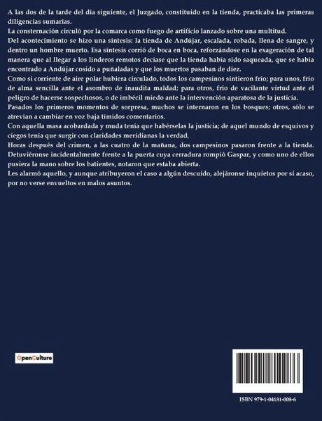 A las dos de la tarde del día siguiente, el Juzgado, constituido en la tienda, practicaba las primeras diligencias sumarias. La consternación circuló por la comarca como fuego de artificio lanzado sobre una multitud. Del acontecimiento se hizo una síntesis: la tienda de Andújar, escalada, robada, llena de sangre, y dentro un hombre muerto. Esa síntesis corrió de boca en boca, reforzándose en la exageración de tal manera que al llegar a los linderos remotos decíase que la tienda había sido saqueada, que se había encontrado a Andújar cosido a puñaladas y que los muertos pasaban de diez. Como si corriente de aire polar hubiera circulado, todos los campesinos sintieron frío; para unos, frío de alma sencilla ante el asombro de inaudita maldad; para otros, frío de vacilante virtud ante el peligro de hacerse sospechosos, o de imbécil miedo ante la intervención aparatosa de la justicia. Pasados los primeros momentos de sorpresa, muchos se internaron en los bosques; otros, sólo se atrevían a cambiar en voz baja tímidos comentarios. Con aquella masa acobardada y muda tenía que habérselas la justicia; de aquel mundo de esquivos y ciegos tenía que surgir con claridades meridianas la verdad. Horas después del crimen, a las cuatro de la mañana, dos campesinos pasaron frente a la tienda. Detuviéronse incidentalmente frente a la puerta cuya cerradura rompió Gaspar, y como uno de ellos pusiera la mano sobre los batientes, notaron que estaba abierta. Les alarmó aquello, y aunque atribuyeron el caso a algún descuido, alejáronse inquietos por si acaso, por no verse envueltos en malos asuntos.