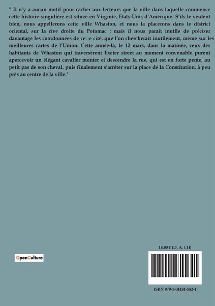 " Il n¿y a aucun motif pour cacher aux lecteurs que la ville dans laquelle commence cette histoire singulière est située en Virginie, États-Unis d¿Amérique. S¿ils le veulent bien, nous appellerons cette ville Whaston, et nous la placerons dans le district oriental, sur la rive droite du Potomac ; mais il nous paraît inutile de préciser davantage les coordonnées de ce¿e cité, que l¿on chercherait inutilement, même sur les meilleures cartes de l¿Union. Cette année-là, le 12 mars, dans la matinée, ceux des habitants de Whaston qui traversèrent Exeter street au moment convenable purent apercevoir un élégant cavalier monter et descendre la rue, qui est en forte pente, au petit pas de son cheval, puis finalement s¿arrêter sur la place de la Constitution, à peu près au centre de la ville."