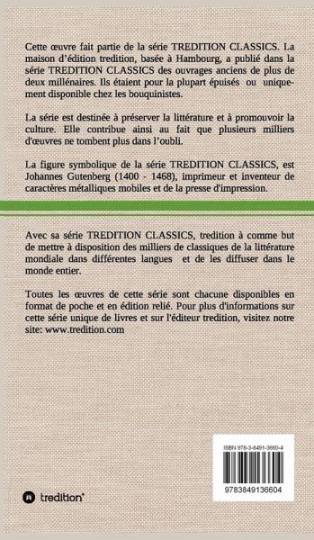 Cette uvre (édition relié) fait partie de la série TREDITION CLASSICS. La maison d édition tredition, basée à Hambourg, a publié dans la série TREDITION CLASSICS des ouvrages anciens de plus de deux millénaires. Ils étaient pour la plupart épuisés ou uniquement disponible chez les bouquinistes. La série est destinée à préserver la littérature et à promouvoir la culture. Avec sa série TREDITION CLASSICS, tredition à comme but de mettre à disposition des milliers de classiques de la littérature mondiale dans différentes langues et de les diffuser dans le monde entier.