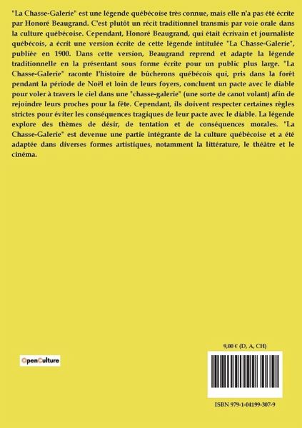 "La chasse galerie: Légendes Canadiennes" est une collection de récits fantastiques écrits par Honoré Beaugrand, qui plonge le lecteur dans l'univers des légendes populaires du Canada français. Le texte principal, "La Chasse-Galerie", raconte l'histoire de bûcherons qui, pour aller voir leurs bien-aimées le soir du Nouvel An, concluent un pacte avec le diable pour voyager en canot volant. Ce récit met en lumière les croyances et superstitions des travailleurs des chantiers forestiers du XIXe siècle, tout en explorant les thèmes de la tentation et du danger. D'autres récits, tels que "Le Loup-Garou" et "La Bête à Grand'queue", enrichissent cette collection en présentant des créatures mythiques et des événements surnaturels qui hantent les campagnes canadiennes. Ces histoires, souvent transmises oralement, sont ancrées dans le folklore et reflètent les peurs et les valeurs des communautés rurales de l'époque. Beaugrand utilise un langage vivant et imagé, fidèle aux expressions populaires, pour donner vie à ces récits envoûtants et mystérieux.