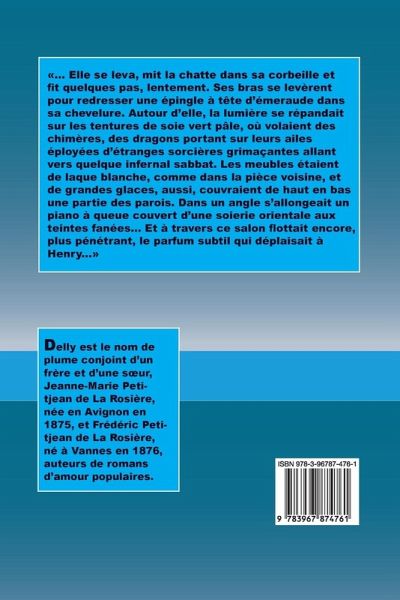 «... Elle se leva, mit la chatte dans sa corbeille et fit quelques pas, lentement. Ses bras se levèrent pour redresser une épingle à tête d'émeraude dans sa chevelure. Autour d'elle, la lumière se répandait sur les tentures de soie vert pâle, où volaient des chimères, des dragons portant sur leurs ailes éployées d'étranges sorcières grimaçantes allant vers quelque infernal sabbat. Les meubles étaient de laque blanche, comme dans la pièce voisine, et de grandes glaces, aussi, couvraient de haut en bas une partie des parois. Dans un angle s'allongeait un piano à queue couvert d'une soierie orientale aux teintes fanées... Et à travers ce salon flottait encore, plus pénétrant, le parfum subtil qui déplaisait à Henry...»
