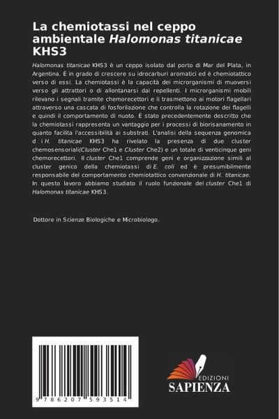 Halomonas titanicae KHS3 è un ceppo isolato dal porto di Mar del Plata, in Argentina. È in grado di crescere su idrocarburi aromatici ed è chemiotattico verso di essi. La chemiotassi è la capacità dei microrganismi di muoversi verso gli attrattori o di allontanarsi dai repellenti. I microrganismi mobili rilevano i segnali tramite chemorecettori e li trasmettono ai motori flagellari attraverso una cascata di fosforilazione che controlla la rotazione dei flagelli e quindi il comportamento di nuoto. È stato precedentemente descritto che la chemiotassi rappresenta un vantaggio per i processi di biorisanamento in quanto facilita l'accessibilità ai substrati. L'analisi della sequenza genomica di H. titanicae KHS3 ha rivelato la presenza di due cluster chemosensoriali(Cluster Che1 e Cluster Che2) e un totale di venticinque geni chemorecettori. Il cluster Che1 comprende geni e organizzazione simili al cluster genico della chemiotassi di E. coli ed è presumibilmente responsabile del comportamento chemiotattico convenzionale di H. titanicae. In questo lavoro abbiamo studiato il ruolo funzionale del cluster Che1 di Halomonas titanicae KHS3.