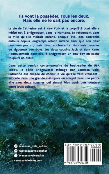 Ils vont la posséder. Tous les deux. Mais elle ne le sait pas encore. La vie de Catherine est à New York et la propriété dont elle a hérité est à Bridgewater, dans le Montana. En retournant dans la ville qu'elle visitait enfant, chaque été, des souvenirs enfouis depuis longtemps refont surface ainsi que son désir pour non pas un, mais deux, adolescents désormais devenus de vigoureux cow-boys. Les deux cousins Jack et Sam Kane. Heureusement pour elle, à Bridgewater, un cow-boy en cache toujours un autre. Dans cette version contemporaine du best-seller de USA Today, la série Bridgewater Ménage par Vanessa Vale, Catherine est obligée de choisir la vie qu'elle veut vraiment : avocate dans une grande métropole ou cowgirl dans une petite ville avec deux hommes qui aiment bien avoir une monture entre leurs cuisses. Attention : Culotte fumante ! La chevauchée sauvage est une histoire romantique et très érotique avec deux cow-boys bourrés de testostérone et une héroïne prise entre eux deux. C'est elle l'héroïne de ce conte moderne - pas de scène mâle / mâle.