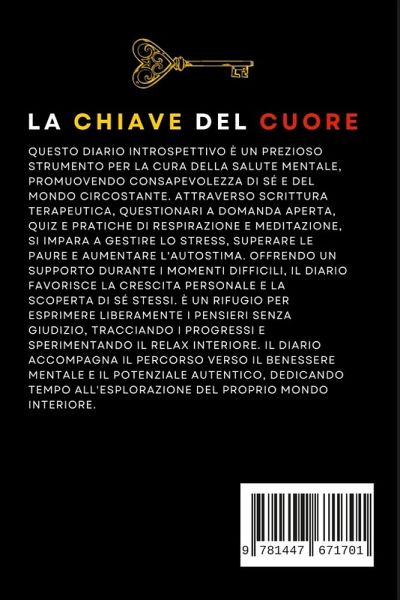 "La Chiave del Cuore" è un diario introspettivo che ti aiuta ad aprire le porte del tuo mondo interiore. Rivolto a ragazze e ragazzi, questo diario speciale è progettato per farti riflettere su te stesso, l'amore, l'amicizia, la famiglia, la gratitudine, il passato e il futuro, offrendoti una miriade di esperienze ed esercizi. Le sue pagine sono un invito a esplorare la profondità dei tuoi pensieri, dei tuoi sentimenti e dei tuoi sogni. Attraverso domande aperte e coinvolgenti, "La Chiave del Cuore" ti guida in un viaggio intimo di autoesplorazione, aiutandoti a comprendere meglio chi sei veramente. Questo diario prezioso non si ferma solo all'introspezione, ma ti sostiene anche nella costruzione di una sana autostima. Gli esercizi appositamente creati ti aiutano a rafforzare la fiducia in te stesso e a scoprire i tuoi talenti unici. Con "La Chiave del Cuore", imparerai a riconoscere il tuo valore e a credere nelle tue capacità. Oltre alle domande illuminanti e agli esercizi di autostima, il diario include affascinanti quiz che ti permetteranno di svelare nuovi aspetti di te stesso. Rispondendo alle domande divertenti e stimolanti, scoprirai sempre di più ciò che ti rende speciale e unico. "La Chiave del Cuore" ti offre anche ampi spazi per annotare i tuoi pensieri, i tuoi obiettivi e le tue gratitudini quotidiane. Questi spazi riservati ti permetteranno di esprimere liberamente le tue emozioni, i tuoi desideri e le tue speranze per il futuro. Sia che tu stia cercando di conoscere te stesso in modo più profondo, affrontare sfide personali o semplicemente esplorare il tuo mondo interiore, "La Chiave del Cuore" è il compagno ideale per accompagnarti in questo viaggio di scoperta e crescita personale. Prendi in mano la tua "Chiave del Cuore" oggi stesso e lasciati guidare dalle sue pagine incantevoli, mentre apri il tuo cuore alla bellezza dell'autenticità e dell'esplorazione interiore.