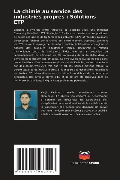 Explorez la synergie entre l'industrie et l'écologie avec "Environmental Chemistry Unveiled : ETP Strategies". Ce livre se penche sur les pratiques de pointe des usines de traitement des effluents (ETP), offrant des solutions perspicaces fondées sur la chimie de l'environnement. Apprenez comment les ETP peuvent sauvegarder la nature, maintenir l'équilibre écologique et adopter des pratiques industrielles vertes. Découvrez la relation harmonieuse entre la croissance industrielle et la protection de l'environnement, en démêlant les fils complexes de la durabilité dans le domaine de la gestion des effluents. Ce livre évalue la qualité de l'eau dans des échantillons d'eau souterraine du district de Kachchh, en se concentrant sur des paramètres clés tels que le pH, les solides dissous totaux, la dureté totale et les métaux lourds. Si la plupart des échantillons respectent les limites BIS, deux d'entre eux se situent en dehors de la fourchette acceptable. Des niveaux élevés d'EC et de TH ont été observés dans de nombreux échantillons, indiquant des problèmes potentiels.