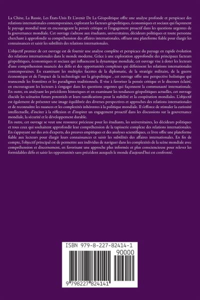 La Chine, La Russie, Les États-Unis Et L'avenir De La Géopolitique offre une analyse profonde et perspicace des relations internationales contemporaines, explorant les facteurs géopolitiques, économiques et sociaux qui façonnent le paysage mondial tout en encourageant la pensée critique et l'engagement proactif dans les questions urgentes de la gouvernance mondiale. Cet ouvrage s'adresse aux étudiants, universitaires, décideurs politiques et toute personne cherchant à approfondir sa compréhension des affaires internationales, offrant une plateforme fiable pour élargir les connaissances et saisir les subtilités des relations internationales. L'objectif premier de cet ouvrage est de fournir une analyse complète et perspicace du paysage en rapide évolution des relations internationales dans le monde moderne. Grâce à une exploration approfondie des principaux facteurs géopolitiques, économiques et sociaux qui influencent la dynamique mondiale, cet ouvrage vise à doter les lecteurs d'une compréhension nuancée des défis et des opportunités complexes qui définissent les relations internationales contemporaines. En examinant les multiples facettes de la diplomatie, de la stratégie militaire, de la guerre économique et de l'impact de la technologie sur la géopolitique , cet ouvrage offre une perspective holistique qui transcende les frontières et les paradigmes traditionnels. Il vise à favoriser la pensée critique et le discours éclairé, en encourageant les lecteurs à s'engager dans les questions urgentes qui façonnent la communauté internationale. En outre, en analysant les précédents historiques et en examinant les tendances géopolitiques actuelles, cet ouvrage élucide les scénarios futurs potentiels et leurs ramifications pour la stabilité et la coopération mondiales. L'objectif est également de présenter une image équilibrée des diverses perspectives et approches des relations internationales et de reconnaître les nuances et les complexités inhérentes à la politique mondiale. Il s'efforce de stimuler la curiosité intellectuelle, d'inciter à la réflexion et d'inspirer un engagement proactif dans les discussions sur la gouvernance mondiale, la sécurité et le développement durable. En outre, cet ouvrage se veut une ressource précieuse pour les étudiants, les universitaires, les décideurs politiques et tous ceux qui souhaitent approfondir leur compréhension de la tapisserie complexe des relations internationales. En s'appuyant sur des avis d'experts, des preuves empiriques et des analyses scientifiques, ce livre offre une plateforme fiable aux lecteurs pour élargir leurs connaissances et saisir les subtilités des affaires internationales. En fin de compte, l'objectif principal est de permettre aux individus de naviguer dans les complexités de la scène mondiale avec compréhension et discernement, en favorisant une approche plus informée et plus consciencieuse pour relever les formidables défis et saisir les opportunités sans précédent auxquels le monde d'aujourd'hui est confronté.
