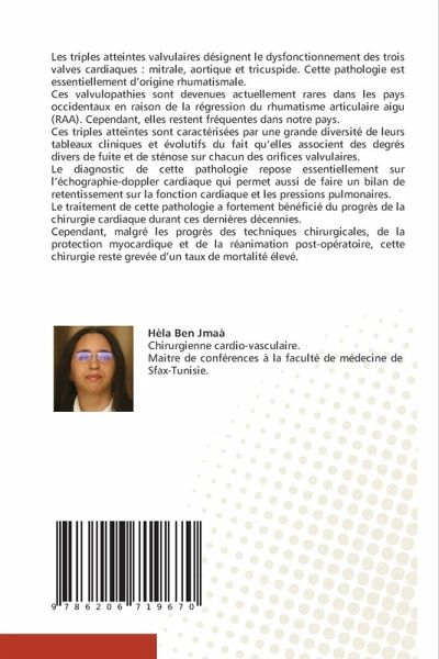 Les triples atteintes valvulaires désignent le dysfonctionnement des trois valves cardiaques : mitrale, aortique et tricuspide. Cette pathologie est essentiellement d'origine rhumatismale. Ces valvulopathies sont devenues actuellement rares dans les pays occidentaux en raison de la régression du rhumatisme articulaire aigu (RAA). Cependant, elles restent fréquentes dans notre pays. Ces triples atteintes sont caractérisées par une grande diversité de leurs tableaux cliniques et évolutifs du fait qu'elles associent des degrés divers de fuite et de sténose sur chacun des orifices valvulaires. Le diagnostic de cette pathologie repose essentiellement sur l'échographie-doppler cardiaque qui permet aussi de faire un bilan de retentissement sur la fonction cardiaque et les pressions pulmonaires. Le traitement de cette pathologie a fortement bénéficié du progrès de la chirurgie cardiaque durant ces dernières décennies. Cependant, malgré les progrès des techniques chirurgicales, de la protection myocardique et de la réanimation post-opératoire, cette chirurgie reste grevée d'un taux de mortalité élevé.