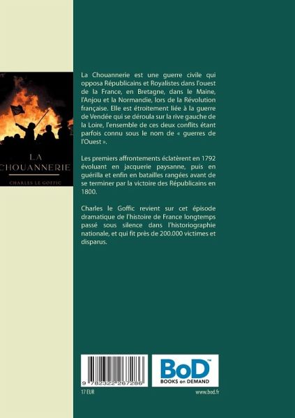 La Chouannerie est une guerre civile qui opposa Républicains et Royalistes dans l'ouest de la France, en Bretagne, dans le Maine, l'Anjou et la Normandie, lors de la Révolution française. Elle est étroitement liée à la guerre de Vendée qui se déroula sur la rive gauche de la Loire, l'ensemble de ces deux conflits étant parfois connu sous le nom de « guerres de l'Ouest ».Les premiers affrontements éclatèrent en 1792 évoluant en jacquerie paysanne, puis en guérilla et enfin en batailles rangées avant de se terminer par la victoire des Républicains en 1800.Charles le Goffic revient sur cet épisode dramatique de l'histoire de France longtemps passé sous silence dans l'historiographie nationale, et qui fit près de 200.000 victimes et disparus.