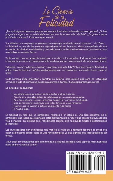¿Por qué algunas personas parecen nunca estar frustradas, estresadas o preocupadas? ¿Te has preguntado alguna vez si existe algún secreto para tener una vida más feliz? ¿Te gustaría saber por dónde comenzar? Entonces sigue leyendo... "La felicidad no es algo que se pospone, sino algo que se diseña para el presente." - Jim Rohn La felicidad es una de las grandes aspiraciones del ser humano. Viene acompañada de una sensación de plenitud y satisfacción y, sin duda, es uno de los sentimientos más importantes y que más influye en nuestro ánimo. Tanto es así, que su ausencia preocupa, y mucho, a los expertos. Incluso se han realizado investigaciones sobre su carencia durante la adolescencia y cómo su estilo de vida les condiciona. Entonces, ¿cómo podemos empezar y mantener una vida feliz? El camino hacia la felicidad es arduo, lleno de baches y señales contradictorias que, en ocasiones, nos pueden hacer perder el norte. Cada persona debe encontrar y construir su camino, pero existen una serie de estrategias comunes a todo el mundo que pueden ayudarnos a transitar hacia esta ansiada meta vital. En este libro, descubrirás: Las diferencias que existen de la felicidad a otros factores. Todo lo que necesitas saber de la felicidad en la ciencia psicológica. Aprende a detener los pensamientos negativos y aumentar la felicidad. Diez pensamientos negativos que todos tenemos y sus remedios. Hábitos que te ayudan a cultivar una mente más fuerte. Y mucho más... La felicidad es más que un sentimiento hermoso o un dibujo de una cara sonriente. Es el sentimiento que indica que realmente estás disfrutando de la vida y que deseas aprovechar esta vida al máximo. La felicidad es el "condimento secreto" que nos puede ayudar a desarrollarnos plenamente. Los investigadores han demostrado que más de la mitad de la felicidad depende de cosas que están bajo nuestro control. Esto es una noticia fabulosa ya que significa que todos podemos ser felices. ¿Qué dices si comenzamos este camino hacia la felicidad duradera? ¡No esperes más! ¡Desplaza hacia arriba y añade al carrito!