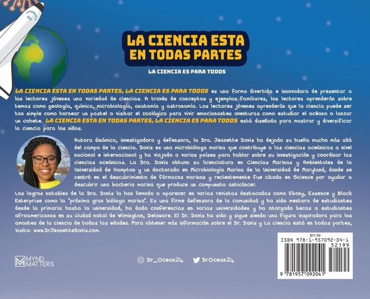 LA CIENCIA ESTA EN TODAS PARTES, LA CIENCIA ES PARA TODOS es una forma divertida e innovadora de presentar a los lectores jóvenes una variedad de ciencias. A través de conceptos y ejemplos familiares, los lectores aprenderán sobre temas como geología, química, microbiología, anatomía y astronomía. Los lectores jóvenes aprenderán que la ciencia puede ser tan simple como hornear un pastel o visitar el zoológico para vivir emocionantes aventuras como estudiar el océano o lanzar un cohete. LA CIENCIA ESTA EN TODAS PARTES, LA CIENCIA ES PARA TODOS está diseñada para mostrar y diversificar la ciencia para los niños.