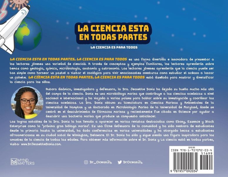 Autora dinámica, investigadora y defensora, la Dra. Jeanette Davis ha dejado su huella mucho más allá del campo de la ciencia. Davis es una microbióloga marina que contribuye a las ciencias oceánicas a nivel nacional e internacional y ha viajado a varios países para hablar sobre su investigación y coordinar las ciencias oceánicas. La Dra. Davis obtuvo su licenciatura en Ciencias Marinas y Ambientales de la Universidad de Hampton y un doctorado en Microbiología Marina de la Universidad de Maryland, donde se centró en el descubrimiento de fármacos marinos y recientemente fue citada en Science por ayudar a descubrir una bacteria marina que produce un compuesto anticáncer.Los logros notables de la Dra. Davis la han llevado a aparecer en varias revistas destacadas como Ebony, Essence y Black Enterprise como la "próxima gran bióloga marina." Es una firme defensora de la comunidad y ha sido mentora de estudiantes desde la primaria hasta la universidad, ha dado conferencias en varias universidades y ha otorgado becas a estudiantes afroamericanos en su ciudad natal de Wilmington, Delaware. El Dr. Davis ha sido y sigue siendo una figura inspiradora para los amantes de la ciencia de todas las edades. Para obtener más información sobre el Dr. Davis y La ciencia está en todas partes, visita: www.DrJeanetteDavis.com.