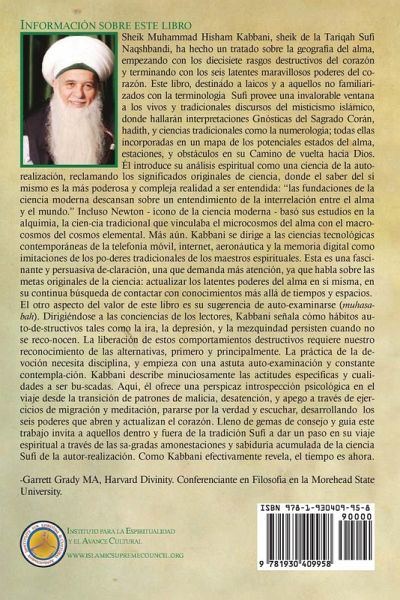 Sheik Muhammad Hisham Kabbani, sheik de la Tariqah Sufí Naqshbandi, ha hecho un tratado sobre la geografía del alma, empezando con los diecisiete rasgos destructivos del corazón y terminando con los seis latentes maravillosos poderes del corazón. Este libro, destinado a laicos y a aquellos no familiarizados con la terminología Sufí provee una invalorable ventana a los vivos y tradicionales discursos del misticismo islámico, donde hallarán interpretaciones Gnósticas del Sagrado Corán, hadith, y ciencias tradicionales como la numerología; todas ellas incorporadas en un mapa de los potenciales estados del alma, estaciones, y obstáculos en su Camino de vuelta hacia Dios. Él introduce su análisis espiritual como una ciencia de la auto-realización, reclamando los significados originales de ciencia, donde el saber del sí mismo es la más poderosa y compleja realidad a ser entendida: "las fundaciones de la ciencia moderna descansan sobre un entendimiento de la interrelación entre el alma y el mundo." Incluso Newton -ícono de la ciencia moderna- basó sus estudios en la alquimia, la ciencia tradicional que vinculaba el microcosmos del alma con el macrocosmos del cosmos elemental. Más aún. Kabbani se dirige a las ciencias tecnológicas contemporáneas de la telefonía móvil, internet, aeronáutica y la memoria digital como imitaciones de los poderes tradicionales de los maestros espirituales. Esta es una fascinante y persuasiva declaración, una que demanda más atención, ya que habla sobre las metas originales de la ciencia: actualizar los latentes poderes del alma en sí misma, en su continua búsqueda de contactar con conocimientos más allá de tiempos y espacios. El otro aspecto del valor de este libro es su sugerencia de auto-examinarse (muhasabah). Dirigiéndose a las conciencias de los lectores, Kabbani señala cómo hábitos auto-destructivos tales como la ira, la depresión, y la mezquindad persisten cuando no se reconocen. La liberación de estos comportamientos destructivos requiere nuestro reconocimiento de las alternativas, primero y principalmente. La práctica de la devoción necesita disciplina, y empieza con una astuta auto-examinación y constante contemplación. Kabbani describe minuciosamente las actitudes específicas y cualidades a ser buscadas. Aquí, él ofrece una perspicaz introspección psicológica en el viaje desde la transición de patrones de malicia, desatención, y apego a través de ejercicios de migración y meditación, pararse por la verdad y escuchar, desarrollando los seis poderes que abren y actualizan el corazón. Lleno de gemas de consejo y guía este trabajo invita a aquellos dentro y fuera de la tradición Sufí a dar un paso en su viaje espiritual a través de las sagradas amonestaciones y sabiduría acumulada de la ciencia Sufí de la autor-realización. Como Kabbani efectivamente revela, el tiempo es ahora. -Garrett Grady MA, Harvard Divinity. Conferenciante en Filosofía en la Morehead State University.