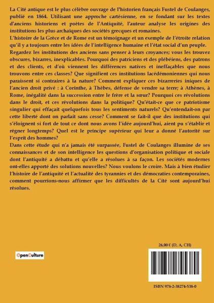 La Cité antique est le plus célèbre ouvrage de l'historien français Fustel de Coulanges, publié en 1864. Utilisant une approche cartésienne, en se fondant sur les textes d'anciens historiens et poètes de l'Antiquité, l'auteur analyse les origines des institutions les plus archaïques des sociétés grecques et romaines. Dans la préface de l'ouvrage, l'historien avertit le lecteur de l'erreur qui consiste à examiner les m¿urs des peuples de l'Antiquité en se référant à celles d'aujourd'hui, alors que l'étude de ces peuples nécessite de faire abstraction de nos préjugés pour ne s'en tenir qu'aux faits. Fustel de Coulanges voit dans la religion et le culte des morts les fondations des institutions des Grecs et des Romains. Chaque famille a ses croyances et ses dieux. C'est ce culte qui dirige les règles en matière de propriété, d'héritage, etc. Avec le passage du temps, la nécessité s'est fait sentir d'ordonner et de mettre en cohérence les règles qui régissent les relations entre les personnes, pour conduire peu à peu à des règles s'appliquant à des entités de plus en plus larges, pour aboutir à la plus vaste, la cité elle-même. Par conséquent, l'origine de la cité est également religieuse, comme en témoignent les lustrations, ces cérémonies de purification périodiques en relation avec le recensement de tous les citoyens, tout comme en témoignent aussi les banquets publics en l'honneur des divinités locales. Cependant, les lois originelles codifiaient les privilèges de l'aristocratie, provoquant l'insatisfaction de la plèbe, pour en arriver à la révolution sociale dans laquelle le bien-être de la société devient le nouveau fondement de la religion, redonnant vie à la cité jusqu'à son extinction avec l'arrivée du christianisme.