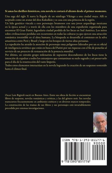 Si amas los thrillers históricos, esta novela te cortará el aliento desde el primer momento. Una saga del siglo X narra la llegada de un náufrago Vikingo a una ciudad maya. Allí es aceptado como un avatar del dios Kukulkán y se casa con una princesa de la región. Un hilo genético vincula a esos personajes brumosos con una joven arqueóloga mexicana en la época actual y a través de ella con los miembros de una expedición organizada para encontrar El Gran Paititi, legendaria ciudad perdida de los Incas en Sud América. Los mitos sobre civilizaciones perdidas son recurrentes en todas las culturas ya que ejercen una atracción romántica irresistible en el alma humana. La búsqueda se desarrolla al comienzo en la selva amazónica entre Perú y Brasil y luego en los bosques de tierras altas peruanas. La expedición ha atraído la atención de personajes muy peligrosos liderados por un ex oficial de inteligencia soviético que están en busca del Paititi por sus riquezas con el fin de ponerlas al servicio de un proyecto de restauración de la potencia mundial. Por último, un extraño grupo milenarista de supuestos descendientes de los Incas tiene la intención de expulsar a todos los extranjeros que contaminan su suelo sagrado y así preservarlo para el día de la resurrección del vasto Imperio. Todos estos elementos interactúan en la novela logrando la creación de un suspenso sostenido hasta el clímax final.