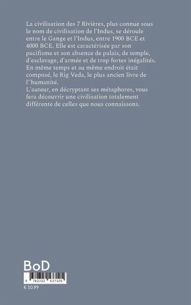 La civilisation des 7 Rivières, plus connue sous le nom de civilisation de l'Indus, se déroule entre le Gange et l'Indus, entre 1900 BCE et 4000 BCE. Elle est caractérisée par son pacifisme et son absence de palais, de temple, d'esclavage, d'armée et de trop fortes inégalités. En même temps et au même endroit était composé, le Rig Veda, le plus ancien livre de l''humanité. L'auteur, en décryptant ses métaphores, vous fera découvrir une civilisation totalement différente de celles que nous connaissons.