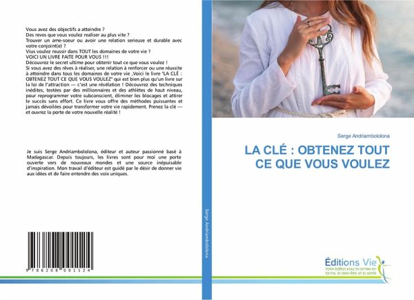 Vous avez des objectifs a atteindre ?Des reves que vous voulez realiser au plus vite ?Trouver un ame-soeur ou avoir une relation serieuse et durable avec votre conjoint(e) ?Vius voulez reussir dans TOUT les domaines de votre vie ?VOICI UN LIVRE FAITE POUR VOUS !!!Découvrez le secret ultime pour obtenir tout ce que vous voulez !Si vous avez des rêves à réaliser, une relation à renforcer ou une réussite à atteindre dans tous les domaines de votre vie ,Voici le livre "LA CLÉ : OBTENEZ TOUT CE QUE VOUS VOULEZ" qui est bien plus qu'un livre sur la loi de l'attraction - c'est une révélation ! Découvrez des techniques inédites, testées par des millionnaires et des athlètes de haut niveau, pour reprogrammer votre subconscient, éliminer les blocages et attirer le succès sans effort. Ce livre vous offre des méthodes puissantes et jamais dévoilées pour transformer votre vie rapidement. Prenez la clé - et ouvrez la porte de votre nouvelle réalité !