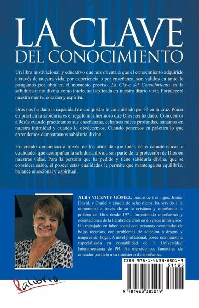 Un libro motivacional y educativo que nos orienta a que el conocimiento adquirido a través de nuestra vida, por experiencia o por enseñanza, son validos en tanto lo pongamos por obra en el momento preciso. La Clave del Conocimiento, es la sabiduría tanto divina como intelectual aplicada en nuestro diario vivir. Fortalecerá nuestra mente, corazón y espíritu. Dios nos ha dado la capacidad de conquistar lo conquistado por Él en la cruz. Poner en práctica la sabiduria es el regalo más hermoso que Dios nos ha dado. Conocemos a Jesús cuando practicamos sus enseñanzas, echamos raices profundas, sanamos en nuestra intimidad y cuando le obedecemos. Cuando ponemos en práctica lo que aprendemos demostramos sabiduría divina. He creado conciencia a través de los años de que todas estas caracteristicas o cualidades que acompañan la sabiduria divina son parte de la protección de Dios en nuestras vidas.Para la persona que ha pedido y tiene sabiduria divina, que se considera sabio, el poseer estas cualidades le permite que mantenga su equilibrio, balance emocional y espiritual.