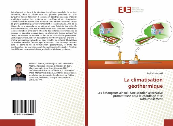 Actuellement, et face à la situation énergétique mondiale, le secteur résidentiel, dont la dépendance aux produits pétroliers est plus qu'avérée, revient fortement à la scène et constitue un enjeu mondial stratégique majeur. Les systèmes de chauffage et de climatisation conventionnels en service dans le monde ont causé et continue à causer de graves problèmes pour l'environnement et la vie humaine. Afin de se libérer de cette dépendance au pétrole et pour l'atteinte des objectifs environnementaux, trois axes d'amélioration sont possibles: rationaliser la consommation, améliorer l'efficacité des systèmes conventionnels et intégrer les énergies renouvelables. La géothermie évoque aujourd'hui l'avenir en matière de confort du fait de sa disponibilité permanente. L'échangeur air-sol, est l'un des systèmes géothermiques qui exploite la chaleur emmagasinée dans le sol pour chauffer ou refroidir l'habitation de manière naturelle. Cet ouvrage s'adresse aux chercheurs qui oeuvrent dans ledomaine de la climatisation géothermique, il traite des questions liées au fonctionnement, la modélisation, le calcul et l'analyse des différents paramètres influençant l'efficacité de ces systèmes.