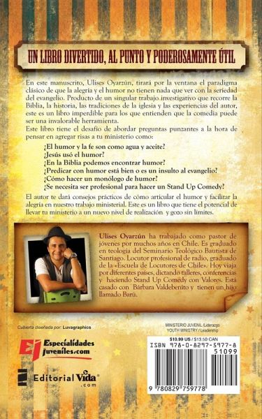 En este manuscrito, Ulises Oyarz¿¿n, tirar¿¿ por la ventana el paradigma cl¿¿sico de que la alegr¿¿a y el humor no tienen nada que ver con la seriedad del evangelio. Producto de un singular trabajo investigativo que recorre la Biblia, la historia, las tradiciones de la iglesia y las experiencias del autor, este es un libro imperdible para los que entienden que la comedia puede ser una invalorable herramienta.Este libro tiene el desaf¿¿o de abordar preguntas punzantes a la hora de pensar en agregar risas a tu ministerio como: ¿¿El humor y la fe son como agua y aceite? ¿¿Jes¿¿s us¿¿ el humor? ¿¿En la Biblia podemos encontrar humor? ¿¿Predicar con humor est¿¿ bien o es un insulto al evangelio? ¿¿C¿¿mo hacer un mon¿¿logo de humor? ¿¿Se necesita ser profesional para hacer un Stand Up Comedy?El autor de dar¿¿ consejos pr¿¿cticos de c¿¿mo articular el humor y facilitar la alegr¿¿a en nuestro trabajo ministerial. Este es un libro que tiene el potencial de llevar tu ministerio a un nuevo nivel de realizaci¿¿n y gozo sin l¿¿mites.