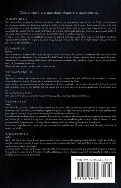 ETERNAMENTE LUI: Non riesco a staccare gli occhi dall'uomo alto, bruno e deciso che ogni mattina viene al mio bar. Voglio quell'estraneo più di quanto abbia mai desiderato qualcuno, anche se ne conosco solo il nome. Sono una scrittrice, e la mia immaginazione è la mia ispirazione, mentre gli uomini come Kane sono la mia musa. Appena se ne va, sono sopraffatta da fantasie che non posso controllare e le mie dita volano sulla tastiera... finché un giorno quasi scatto. Il mio sfogo imbarazzante mi fa correre fuori; lui mi intercetta e mi porta a casa sua.Anche se è un rischio, non so resistergli. Gli basta un bacio, e sono sua. Quest'uomo rapirà il mio cuore facendomi impazzire eternamente. Mi toglierà il piacere di qualunque altro uomo. Ma io non voglio nessun altro, perché sarà per sempre, eternamente lui. SOLAMENTE LUI: Non mi sarei mai aspettata che il ragazzo per cui avevo una cotta alle superiori si trasferisse nella casa vicina alla mia. Non ho mai desiderato altri, solamente lui. Reid Turner è la mia fantasia assoluta, tant'è che ancora lo voglio. Follemente. Quando si accorge dalla finestra della mia camera da letto che prendo in pugno la situazione con le mie mani, c'è una svolta improvvisa... Adesso che sta con me, non lo lascerò più andar via. NECESSARIAMENTE LUI: Ogni anno, la stessa settimana, viene per cinque giorni nel mio piccolo resort nel Maine, poi sparisce. È un uomo tetro, combattuto, ma mi intriga e devo necessariamente conoscerne la storia.Spero che torni anche quest'anno, perché sono determinata a parlargli, a farmi notare da lui, che altrimenti non mi vede neanche, come se non esistessi. Gli farò capire che non sono solo una persona qualunque che gli passa una chiave.No: quest'anno sarà diverso. Non vado a letto con un uomo da troppo tempo, quindi...hashtag necessariamente lui. PAZZAMENTE LEI: Amo Bree da una vita. L'abbiamo fatto insieme per la prima volta, quando eravamo giovani e inesperti, ma io ho incasinato tutto. L'ho delusa, facendola piangere e scappar via. Negli anni, però, ho imparato, mi sono perfezionato e ho sognato di avere un giorno un'altra possibilità con l'amore della mia vita.Quando finalmente l'opportunità si presenta, Bree si rivela una donna che non mi sarei mai sognato, nemmeno nelle mie fantasie più scatenate. La ragazzina che indossava sempre prendisole gialli non è più Bree, è Brianna, la mia nuova amante. Sono disposto a tutto per farmi perdonare da lei, anche inginocchiarmi e implorare.Però c'è solo un problemino... io rivoglio pazzamente Bree, non Brianna. Quando riavrò Bree, Brianna potrà fare di me ciò che vuole. SEGRETAMENTE LUI: Ogni volta che il mio vicino di casa passa davanti a casa mia facendo jogging, faccio del mio meglio per tentarlo. Lavo la macchina, annaffio il prato, faccio yoga sull'erba esponendo tutti i miei punti forti. Non so bene se mi noti, ma lui a me di sicuro non sfugge.Un giorno cade... tra le mie braccia e nel mio letto. Che sorpresa: siamo anche più compatibili di quanto credessi. Però poi lui mi svela chi è e il mondo mi crolla addosso, perché se dovesse scoprire il mio segreto, la nostra storia finirebbe prima ancora di cominciare.