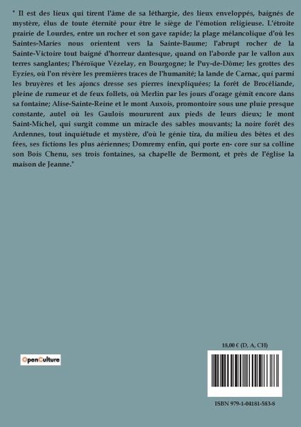 " Il est des lieux qui tirent l'âme de sa léthargie, des lieux enveloppés, baignés de mystère, élus de toute éternité pour être le siège de l'émotion religieuse. L'étroite prairie de Lourdes, entre un rocher et son gave rapide; la plage mélancolique d'où les Saintes-Maries nous orientent vers la Sainte-Baume; l'abrupt rocher de la Sainte-Victoire tout baigné d'horreur dantesque, quand on l'aborde par le vallon aux terres sanglantes; l'héroïque Vézelay, en Bourgogne; le Puy-de-Dôme; les grottes des Eyzies, où l'on révère les premières traces de l'humanité; la lande de Carnac, qui parmi les bruyères et les ajoncs dresse ses pierres inexpliquées; la forêt de Brocéliande, pleine de rumeur et de feux follets, où Merlin par les jours d'orage gémit encore dans sa fontaine; Alise-Sainte-Reine et le mont Auxois, promontoire sous une pluie presque constante, autel où les Gaulois moururent aux pieds de leurs dieux; le mont Saint-Michel, qui surgit comme un miracle des sables mouvants; la noire forêt des Ardennes, tout inquiétude et mystère, d'où le génie tira, du milieu des bêtes et des fées, ses fictions les plus aériennes; Domremy enfin, qui porte en- core sur sa colline son Bois Chenu, ses trois fontaines, sa chapelle de Bermont, et près de l'église la maison de Jeanne."