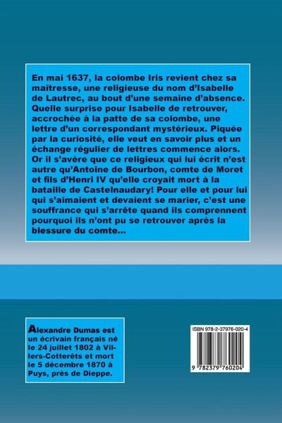 En mai 1637, la colombe Iris revient chez sa maîtresse, une religieuse du nom d’Isabelle de Lautrec, au bout d’une semaine d’absence. Quelle surprise pour Isabelle de retrouver, accrochée à la patte de sa colombe, une lettre d’un correspondant mystérieux. Piquée par la curiosité, elle veut en savoir plus et un échange régulier de lettres commence alors. Or il s’avère que ce religieux qui lui écrit n’est autre qu’Antoine de Bourbon, comte de Moret et fils d’Henri IV qu’elle croyait mort à la bataille de Castelnaudary! Pour elle et pour lui qui s’aimaient et devaient se marier, c’est une souffrance qui s’arrête quand ils comprennent pourquoi ils n’ont pu se retrouver après la blessure du comte...